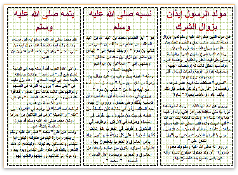 نشر المعرفة بطاقة تعريفية بمولد الرسول صلى الله عليه وسلم ونسبه ويتمه ويمكن توظيفها في درس الرسول صلى الله عيه وسلم طفلا بالمستوى الثالث إبتدائي