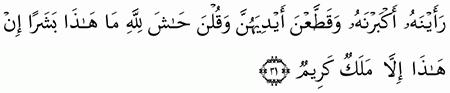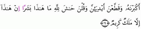 ف ل م ا س م ع ت ب م ك ر ه ن أ ر س ل ت إ ل ي ه ن و أ ع ت د ت ل ه ن م ت ك أ و آت ت ك ل و اح د ة م ن ه ن س ك ين ا و ق ال ت اخ ر ج ع ل ي ه ن ف ل م ا ر أ ي ن ه أ ك ب ر ن ه و ق ط ع ن أ ي د ي ه ن و ق ل ن ح اش ل ل ه م ا ه ذ ا