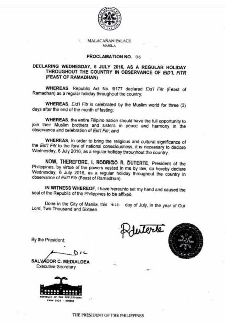 Duterte Declares June 15 2018 A Regular Holiday For Eid L Fitr The Summit Express